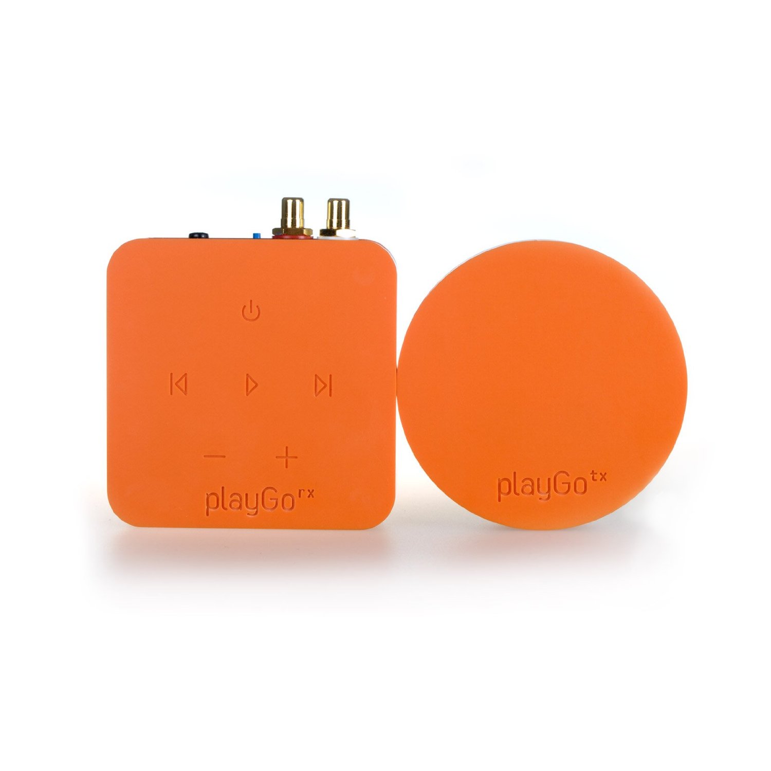 A series of LED lights indicate activity, and the receiver unit features play and volume controls. reaches a wireless range of around 75-feet, and the transmitter is compatible with up to 4 receiver units simultaneously. The receiver unit will require AC power.